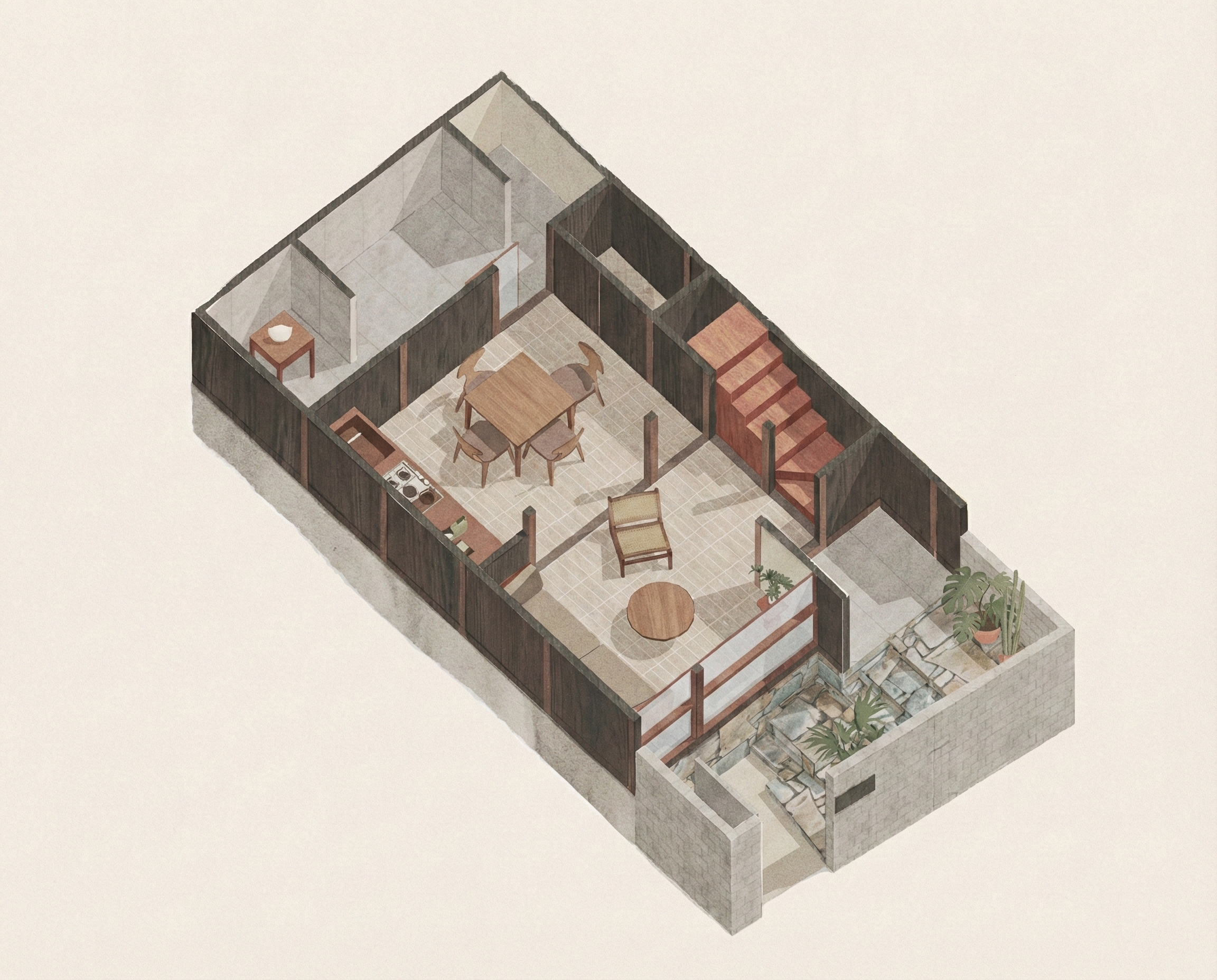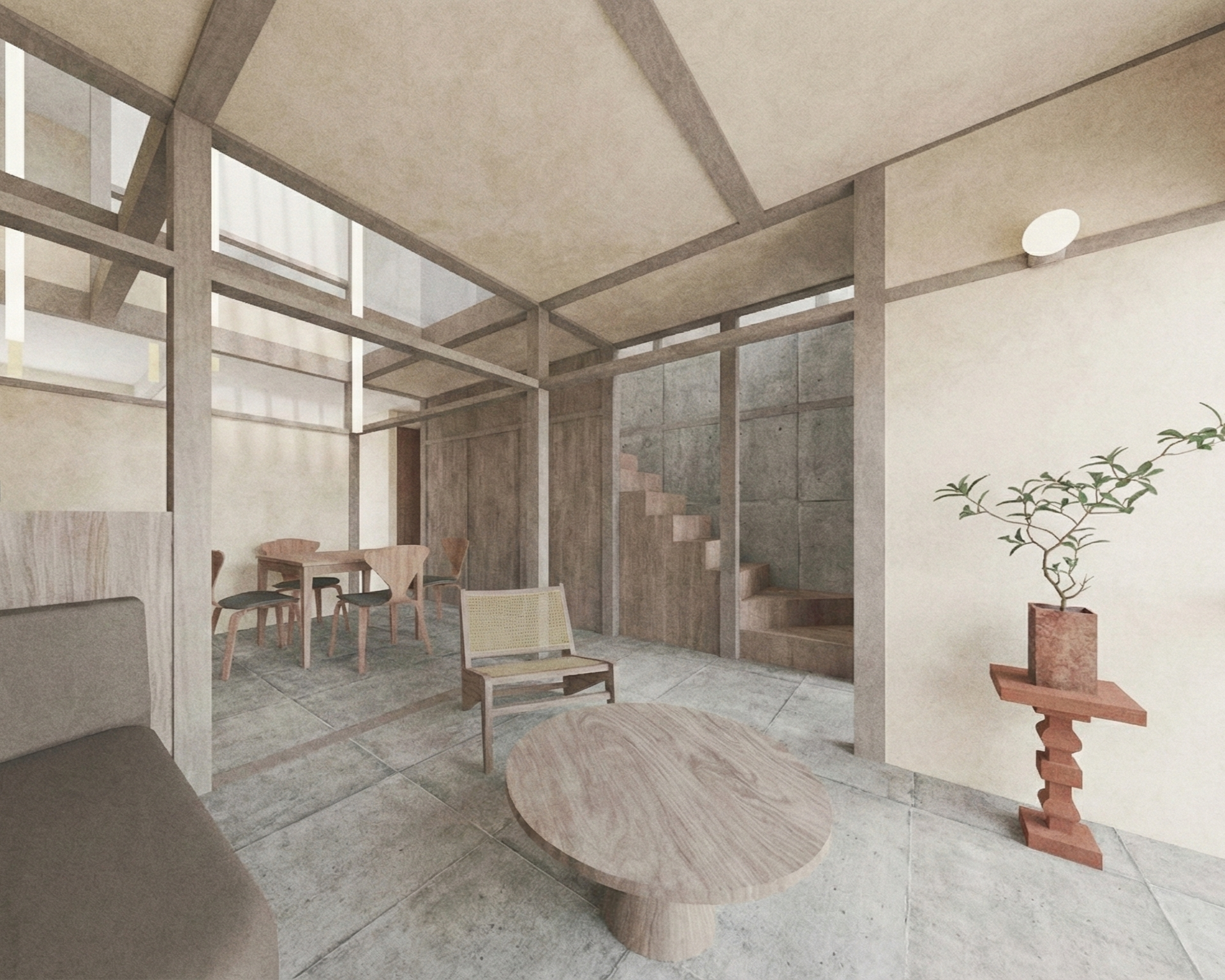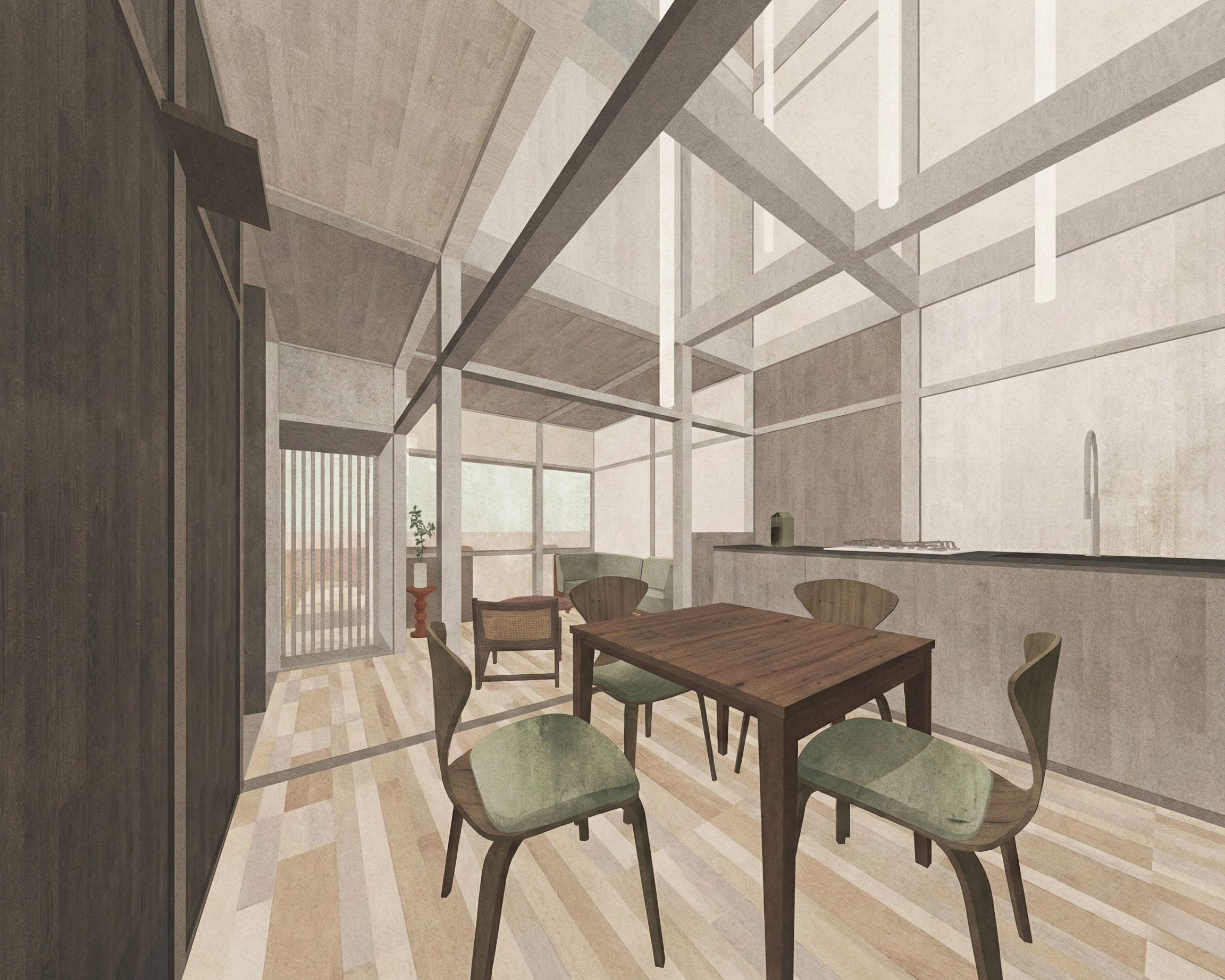 This project renovates an existing Kyoto machiya, transforming a traditional wooden townhouse into a contemporary living space while preserving its structural and cultural essence. The design focuses on revealing the original timber framework—columns, beams, and rafters—as the primary spatial language, allowing the structure itself to define rhythm and proportion.